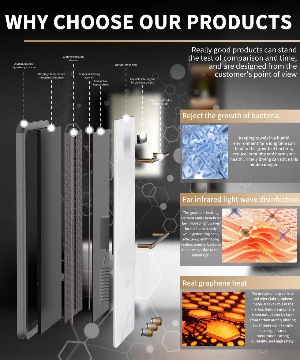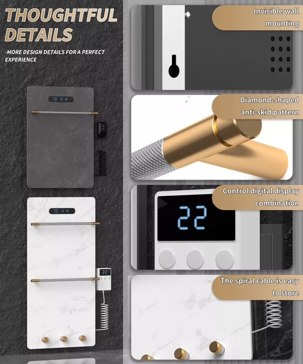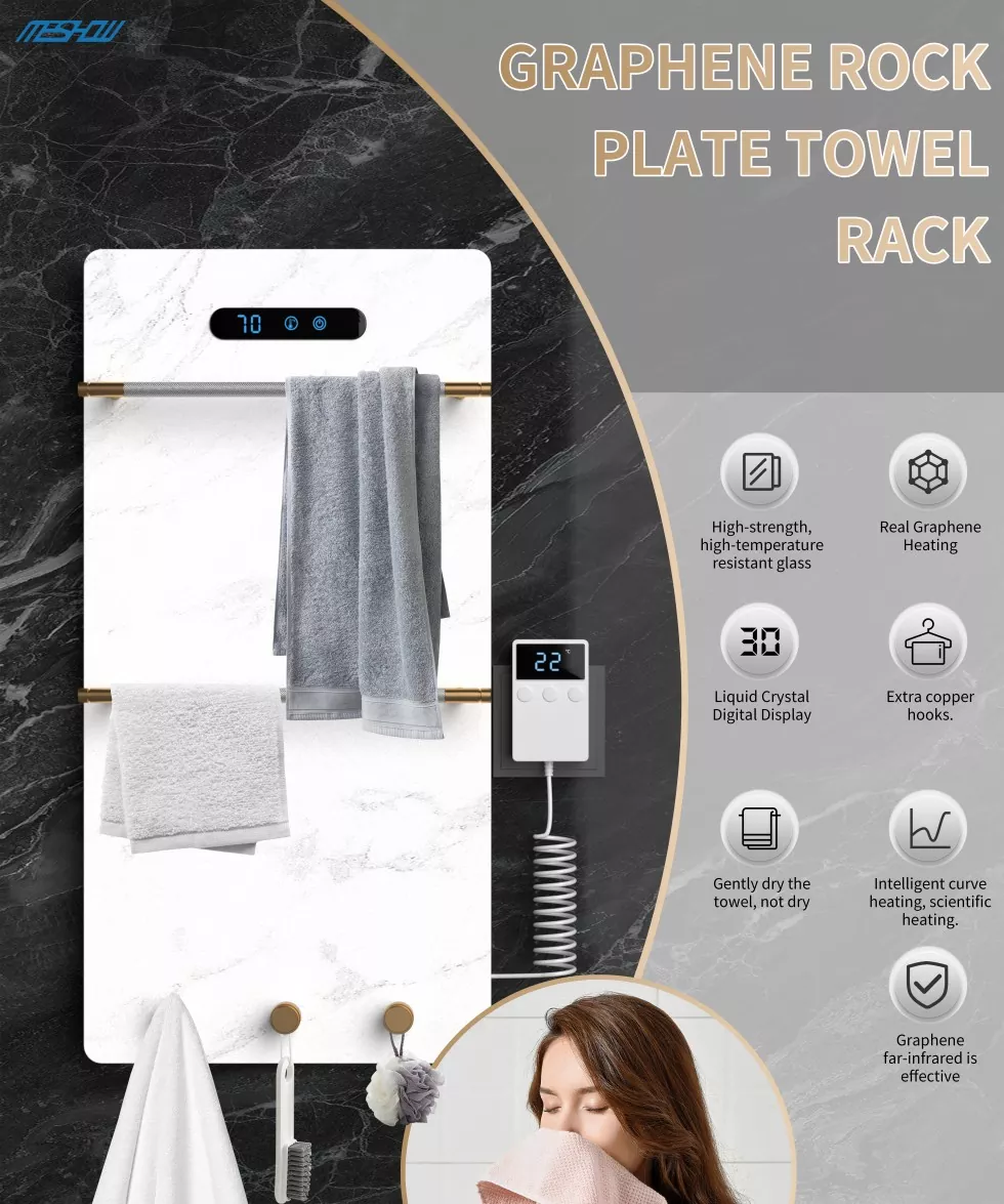 Црни графички ручни сталак за пешкире брзо суши пешкире, одржавајући сувоћу и спречавајући раст бактерија и калупа узрокованог влагом, стварајући здравије окружење употребе. Коришћењем 4-16 μ М далеког инфрацрвеног зрачења за пренос топлотне енергије, потврђује их ауторитативне институције да је убијање ефикасности штетних бактерија попут стафилокока ауре-а, а ефекат уклањања гриња је 100%, а ефикасно сузбијати репродукцију бактерија и смањење појаве мириса.